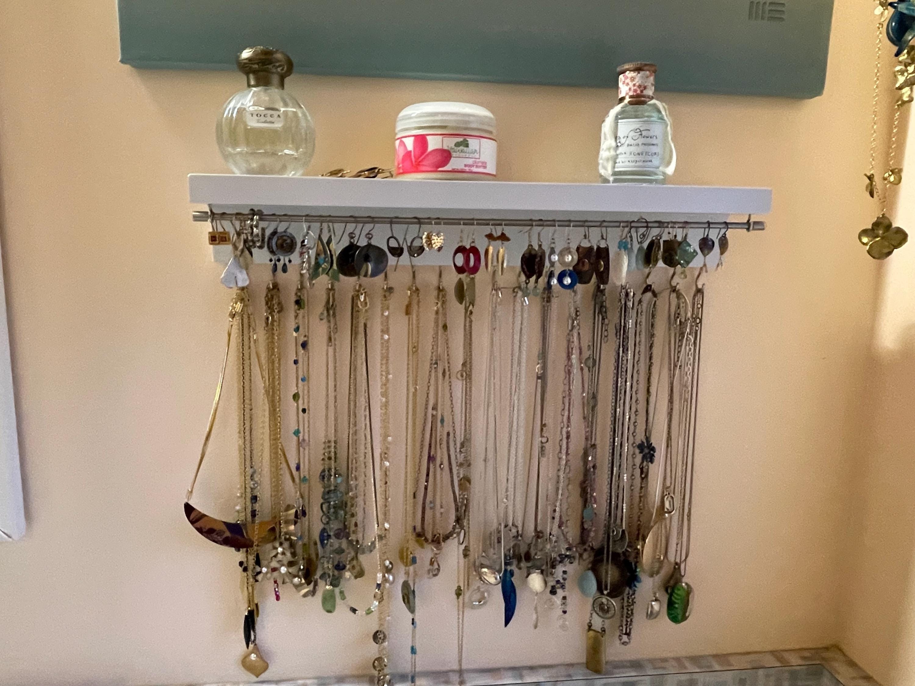 This handcrafted wall mount jewelry shelf is the perfect blend of class and functionality.