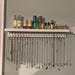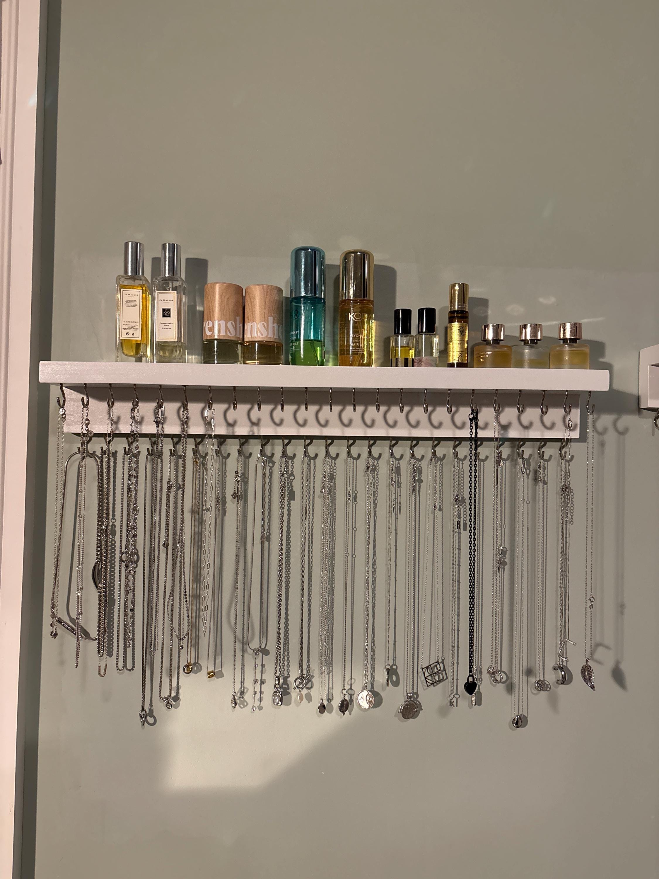 This handcrafted organizer has a shelf as well as extra hooks for necklaces and bracelets