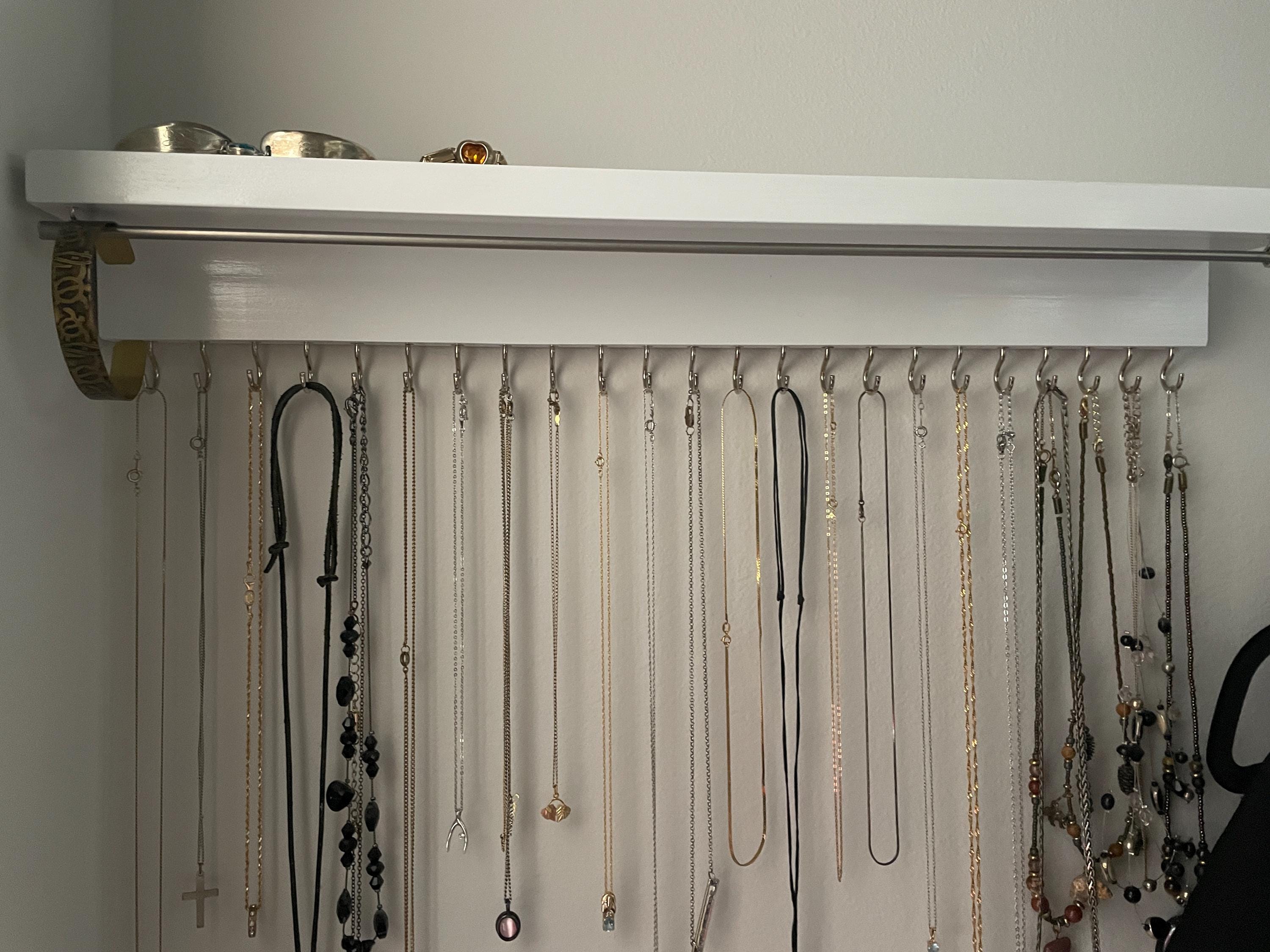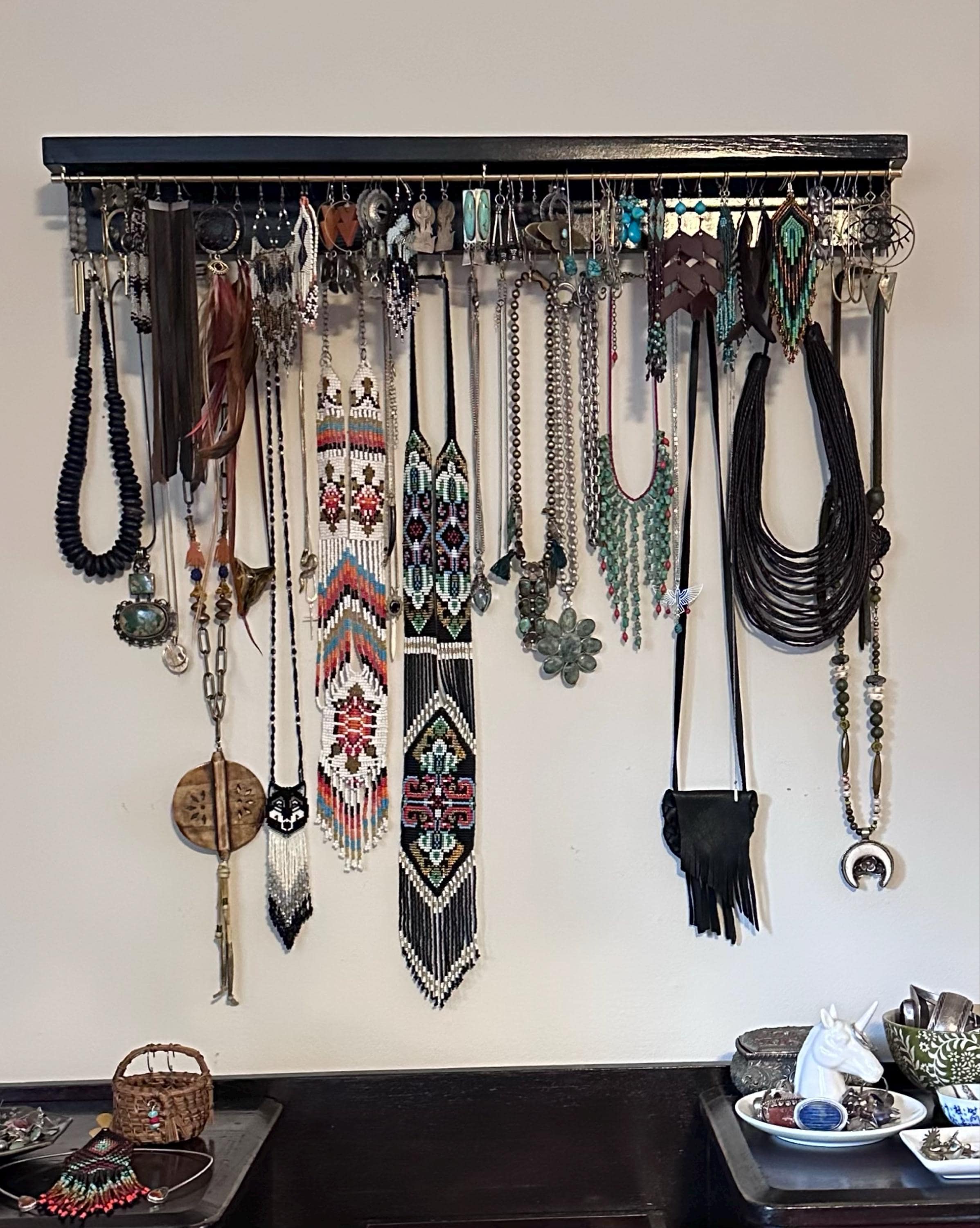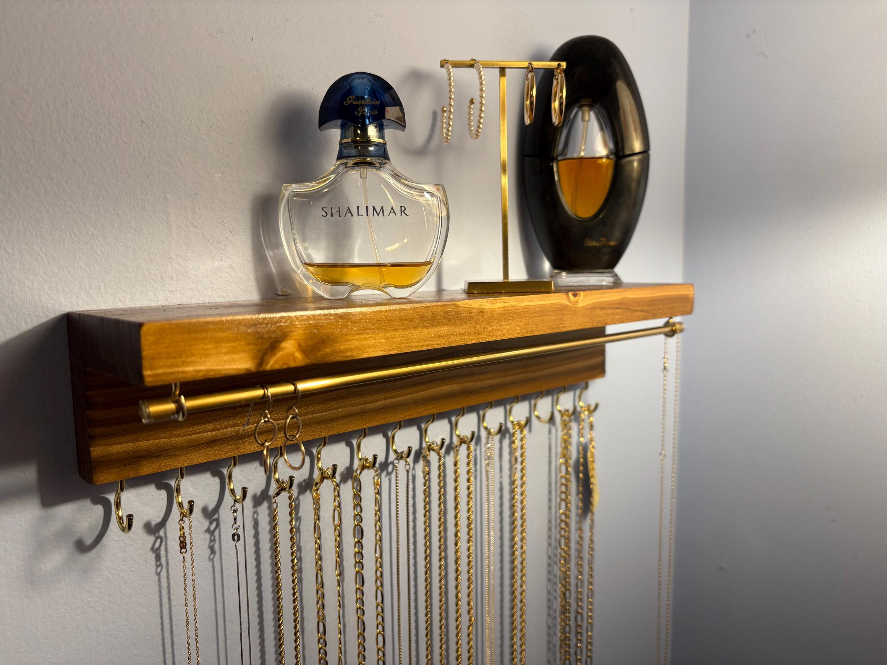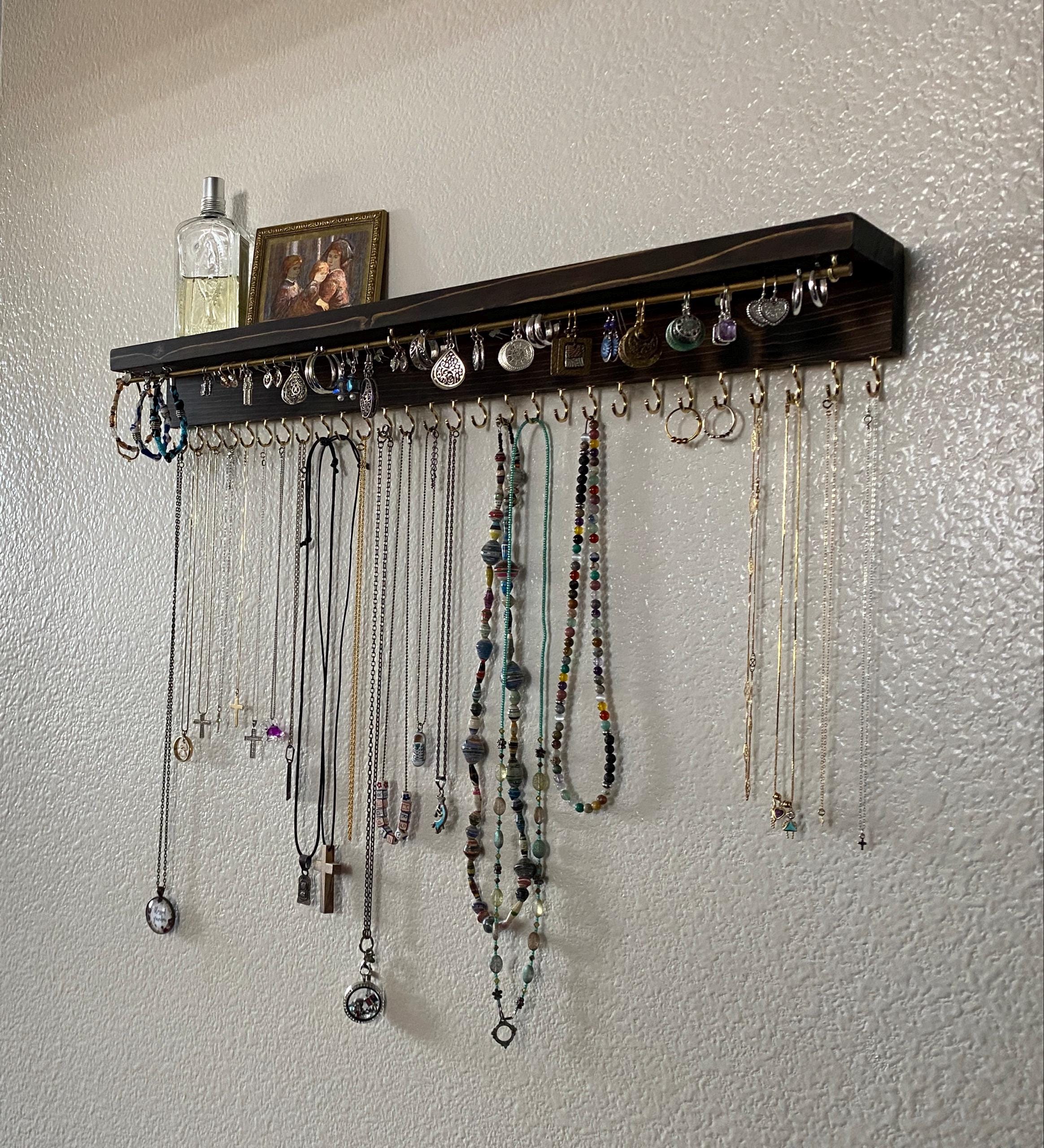 This handcrafted wall mount jewelry shelf is the perfect blend of class and functionality.