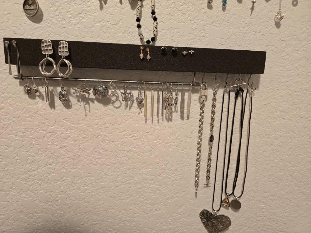 The item is aesthetically pleasing however I find that it is not as functional as expected. The cross bar for dangle earrings is set too close to the corkboard for studs, etc making it difficult to hang the dangle earrings. I'm an older woman but don't have problems with hand mobility or arthritis so I think the awkwardness I experience trying to use this holder is design based not user based.