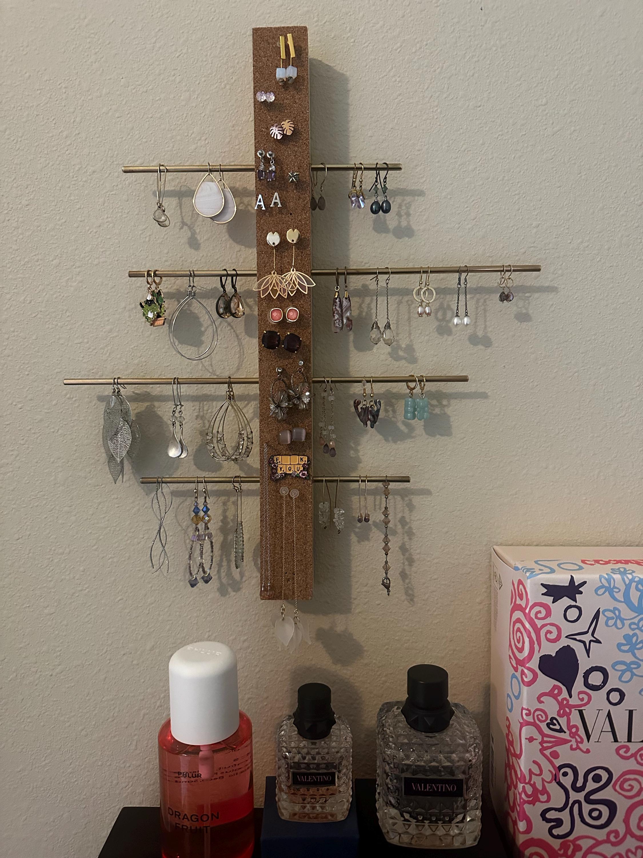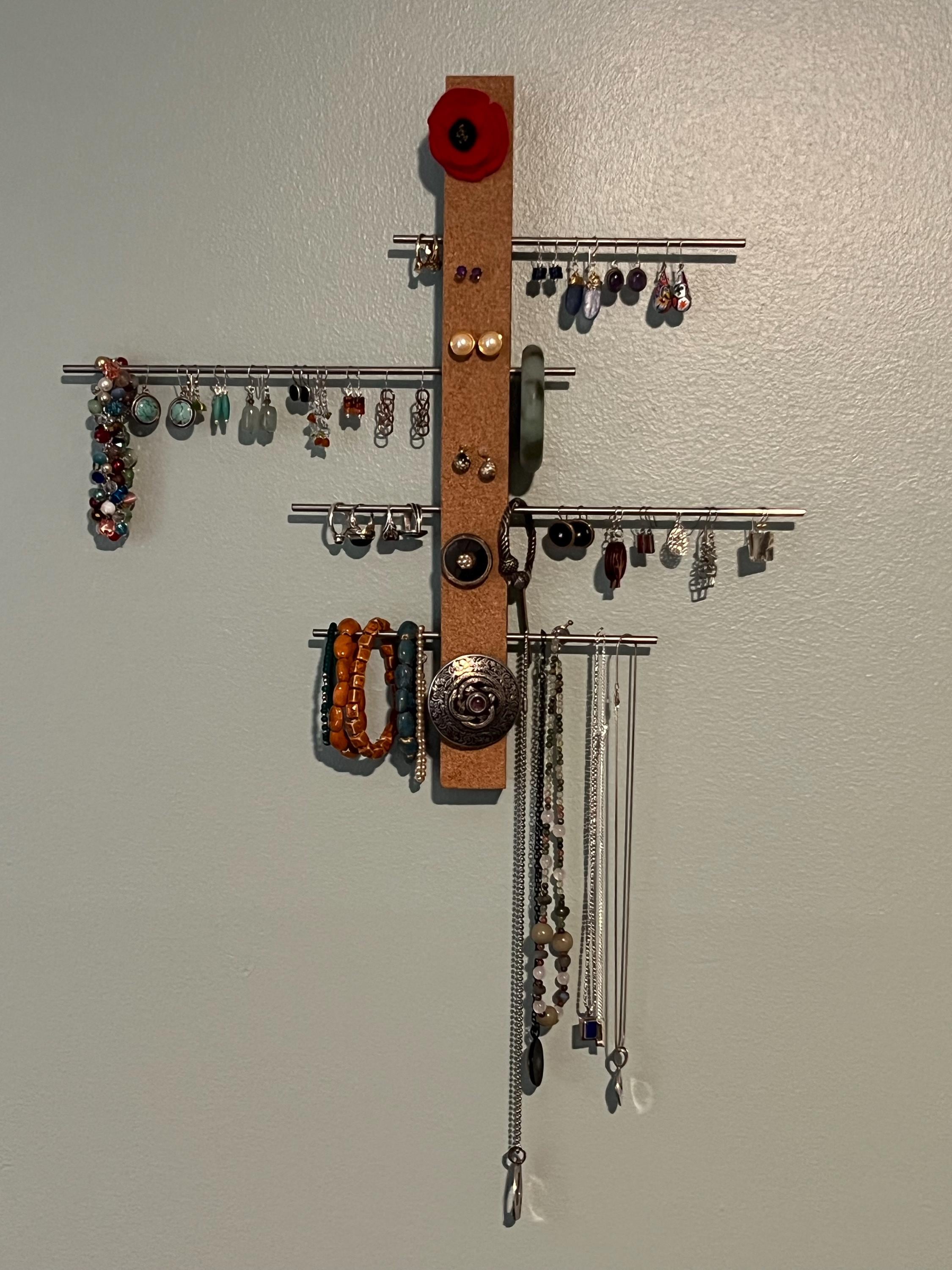 This handcrafted jewelry tree was created as a functional method of hanging jewelry, as well as a one-of-a-kind piece of wall art.